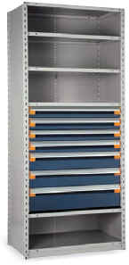 (2)ea - 3" drawers @ 30 compartments/ea (3)ea - 4" drawers @ 30 compartments/ea (2)ea - 6" drawers @ 12 compartments/ea (1)ea Roll-Out Front Access Shelf |