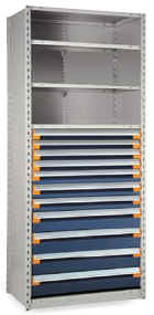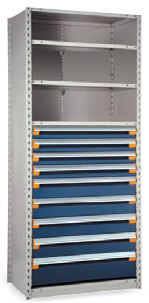 - 3" drawers @ 30 compartments/ea (3)ea - 4" drawers @ 30 compartments/ea (2)ea - 6" drawers @ 12 compartments/ea (1)ea Roll-Out Front Access Shelf |